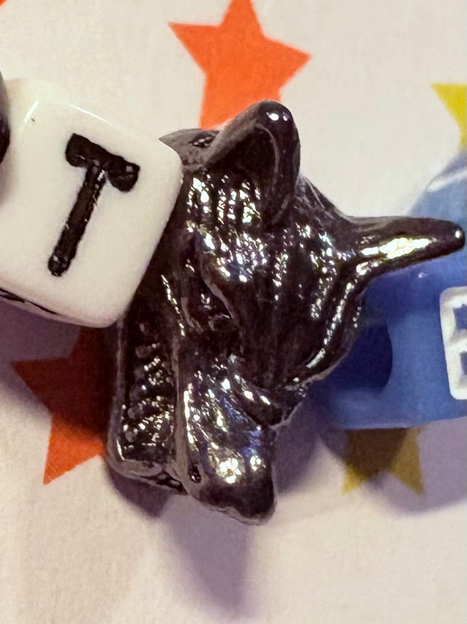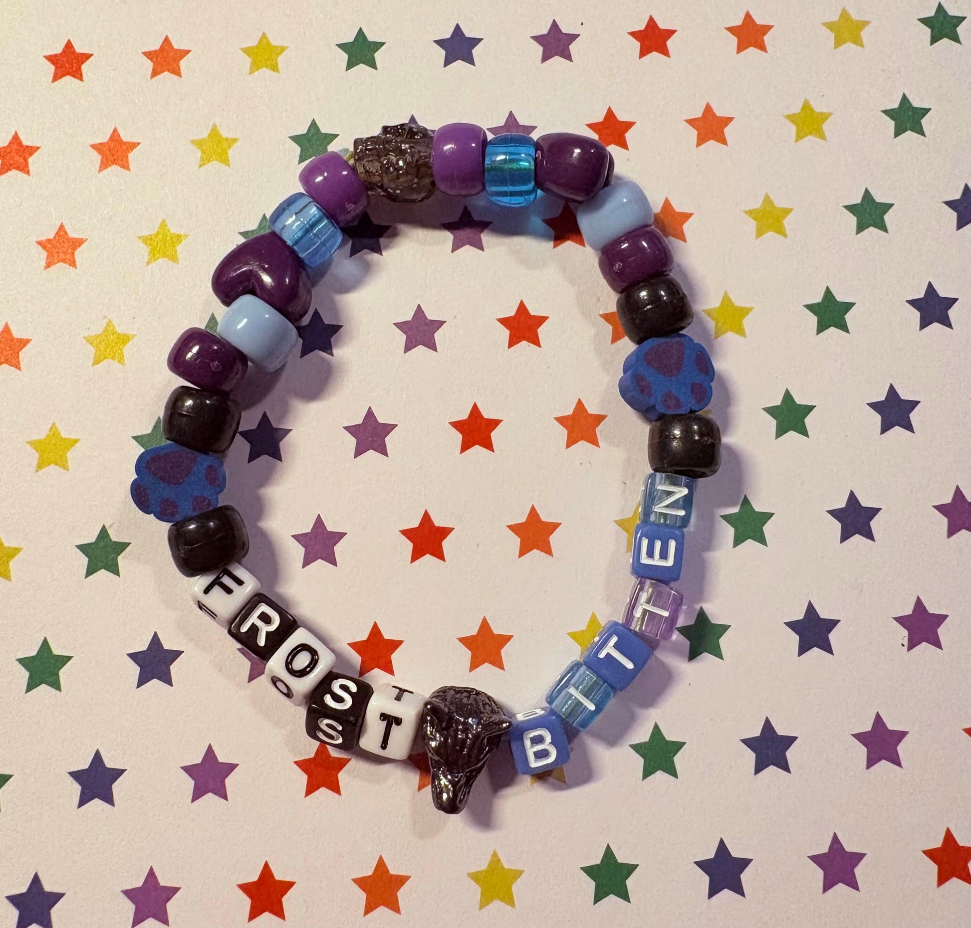 this kandi features a metal wolf head bead, two blue and purple clay paw beads, two purple heart beads, and a sparkly black skull!