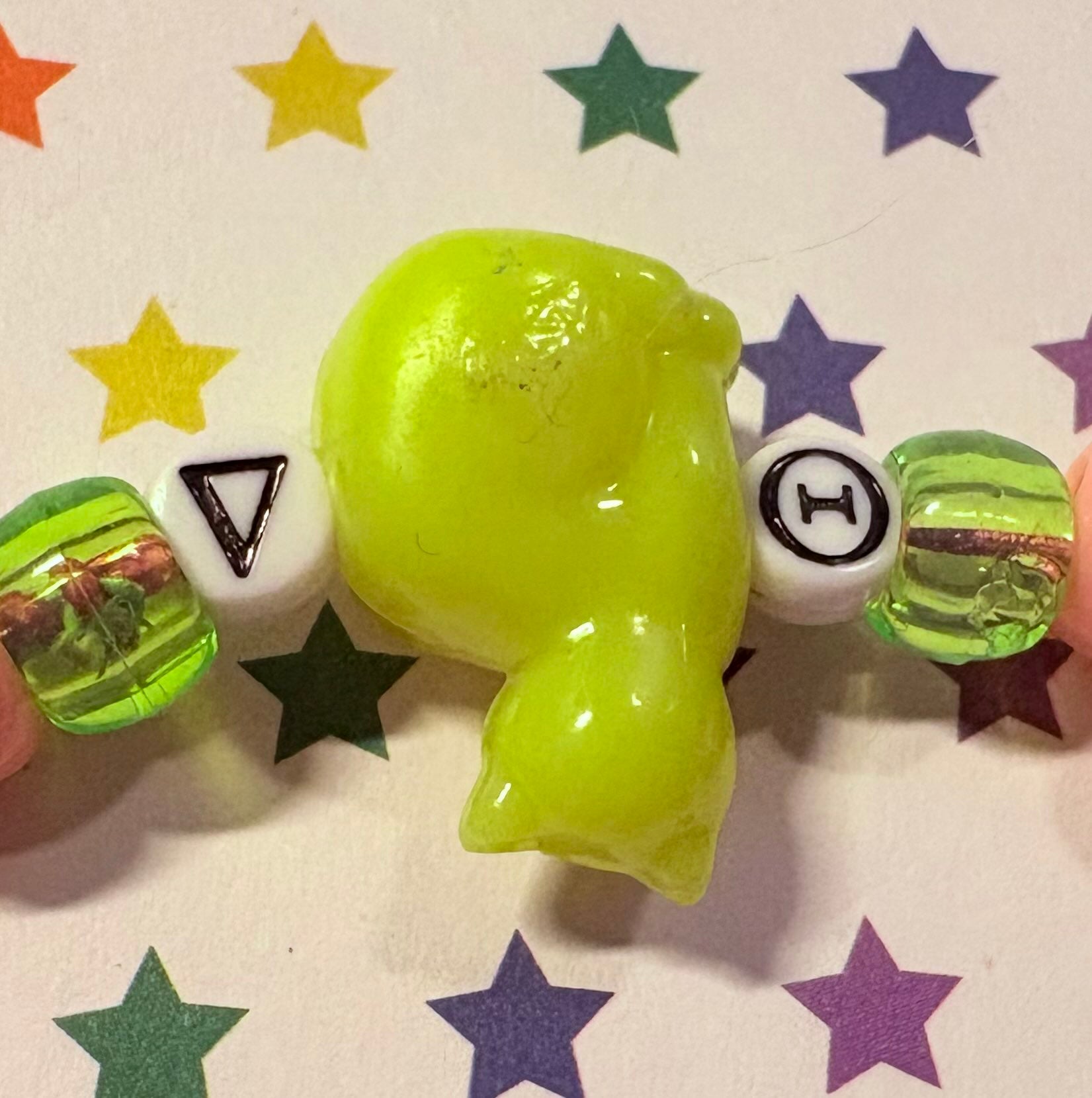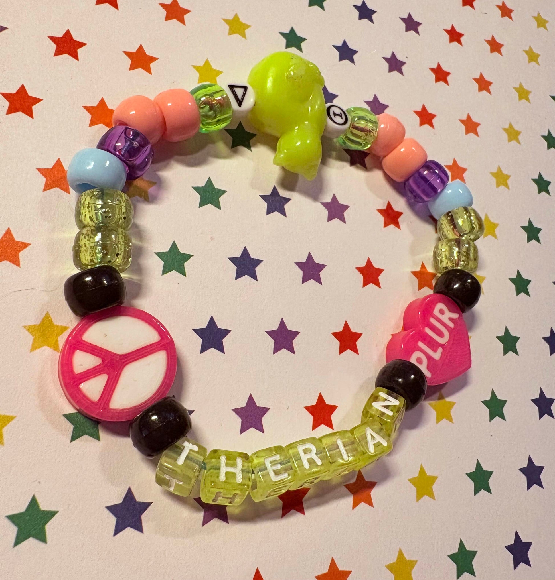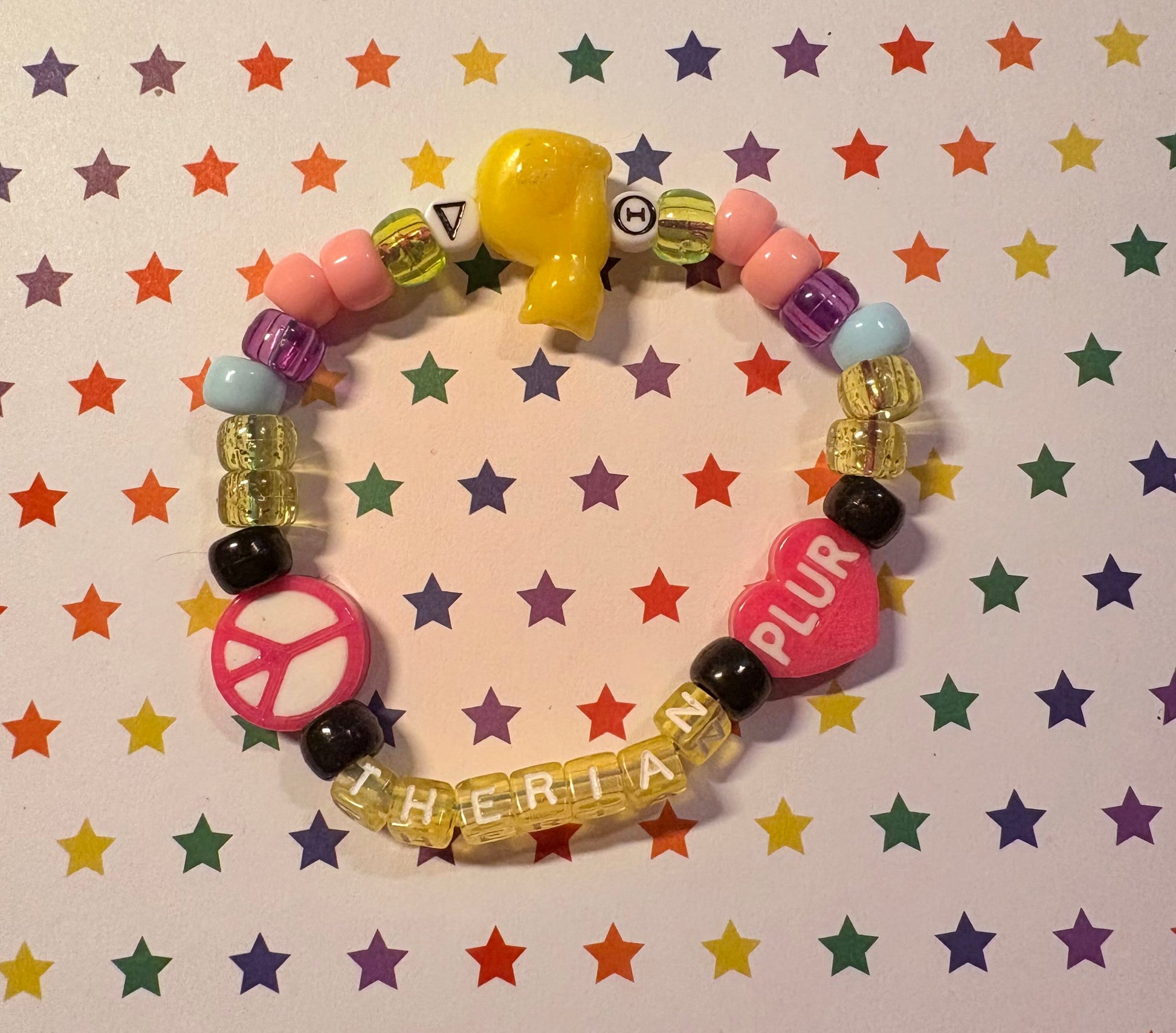 this kandi features two 3d printed beads; the peace sign and the pink PLUR heart, a yellow cat, and the theta delta symbols!