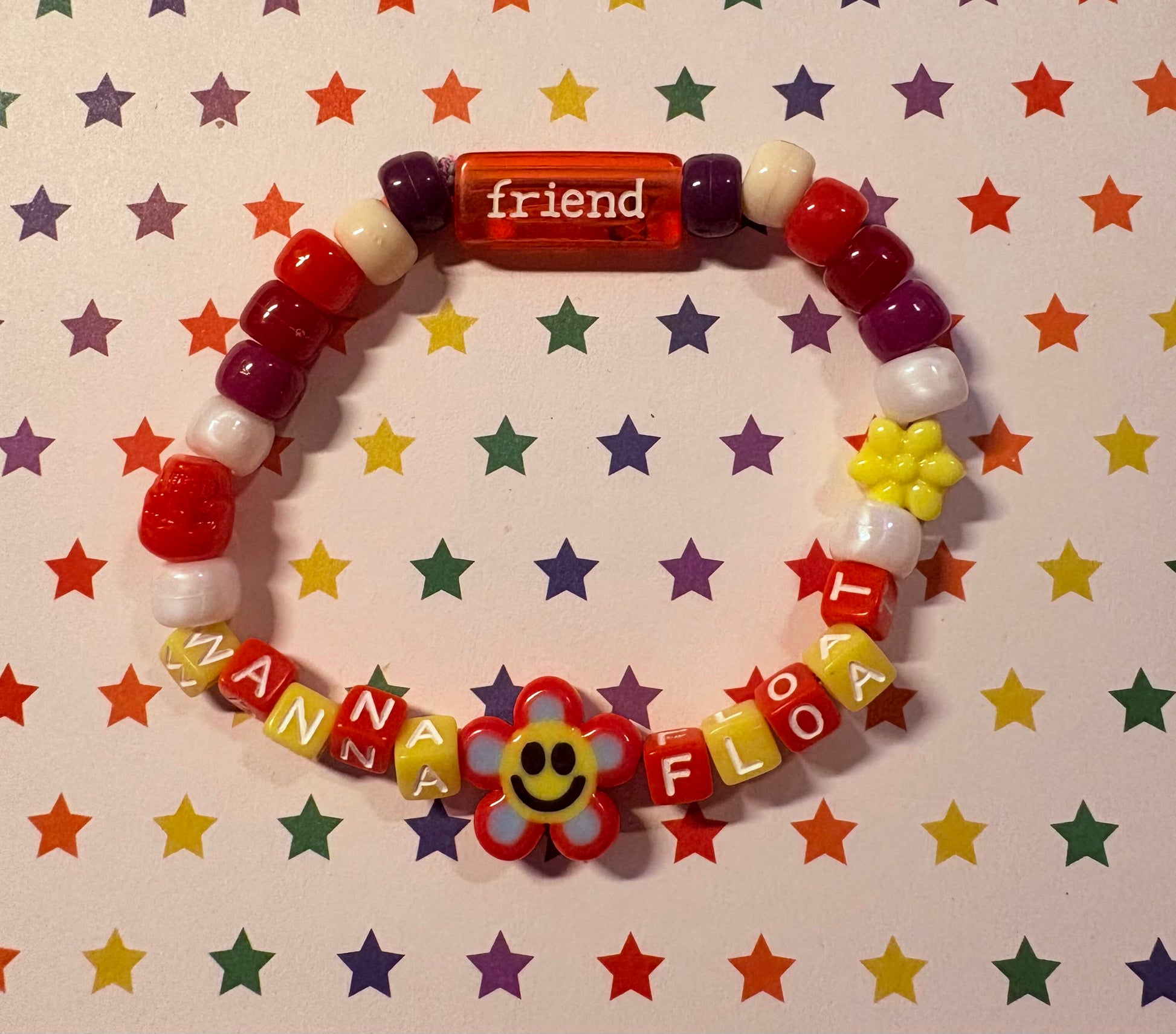 this kandi features a 3d printed flower with a smiley face, a redΒ skull, a yellow flower, and a red text bead that has "friend" on one side, "gentle" on the other!